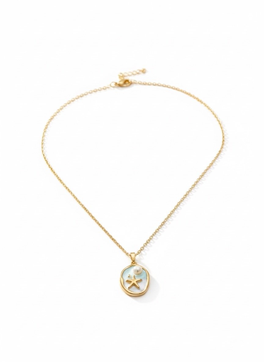 & Free ShippingTransport yourself to the Mediterranean coast with The Aqua Stella Green Pendant Necklace. This centrepiece features a shimmering gold-toned starfish resting on a serene duo-tone enamel backdrop of turquoise and sea-salt white.