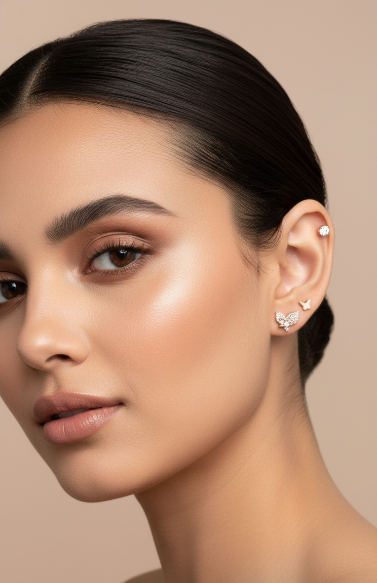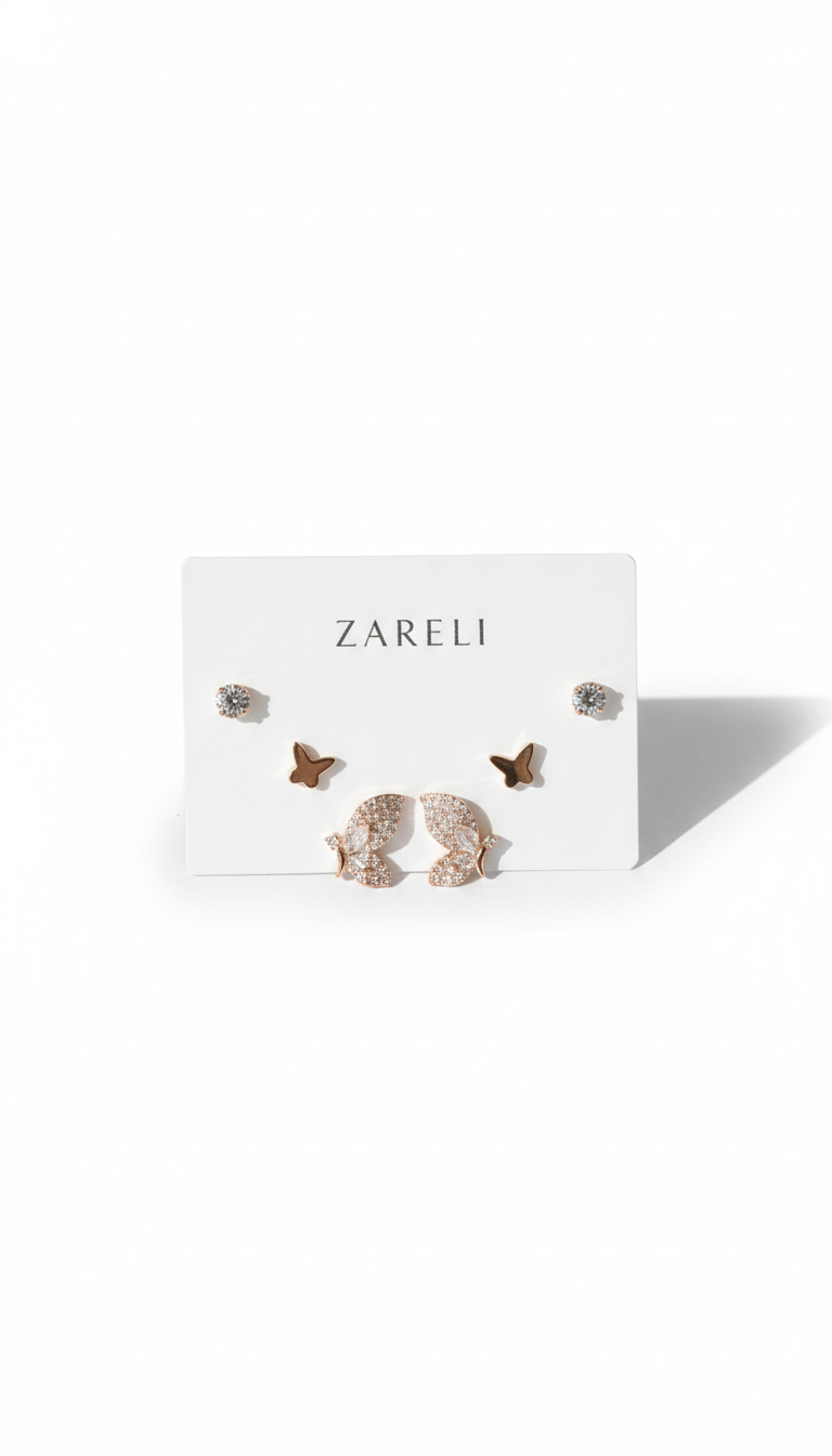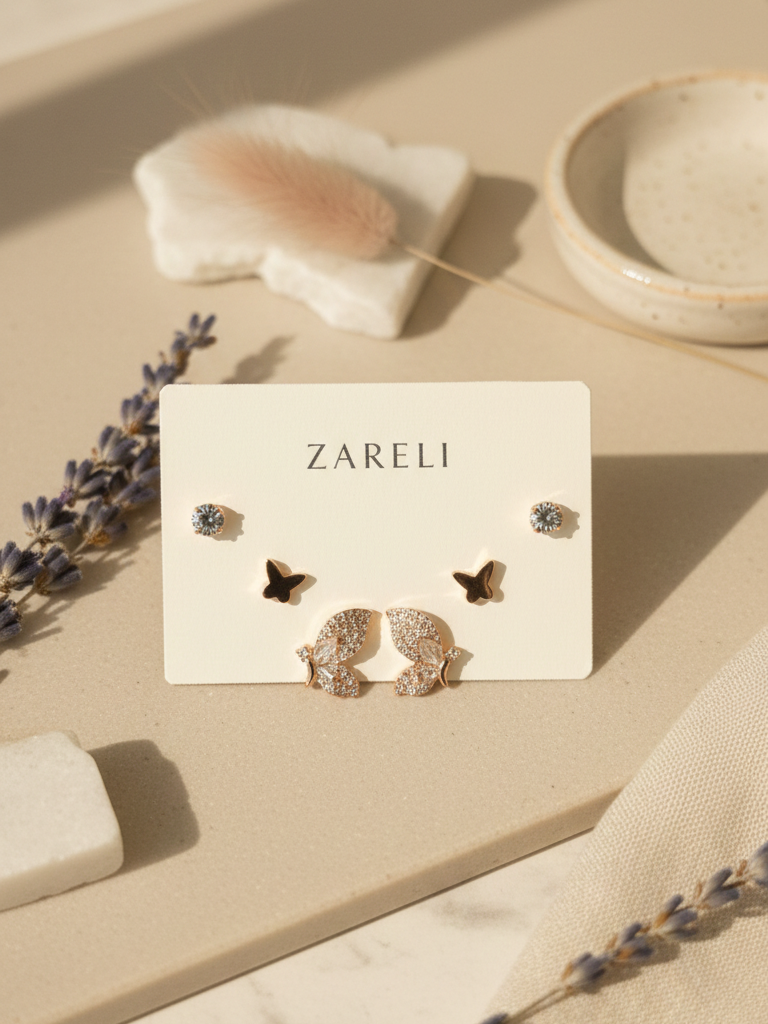 A curated flight of elegance. This three-pair set features delicate gold silhouettes and brilliant-cut crystals, centered by our signature pavé butterfly wings.